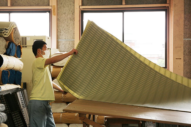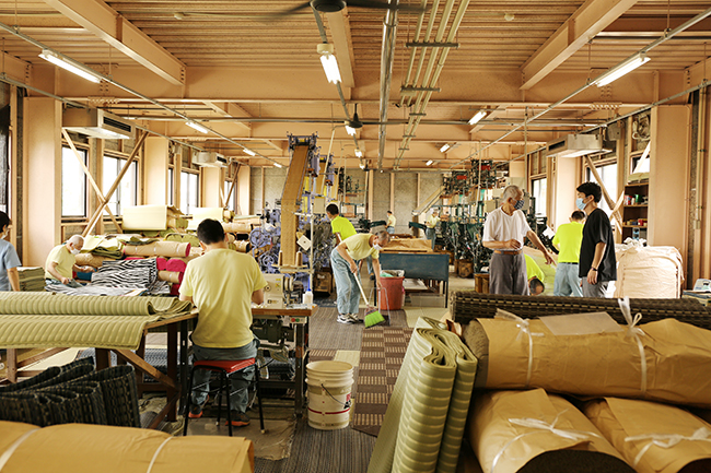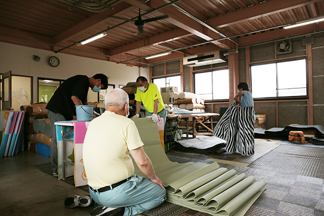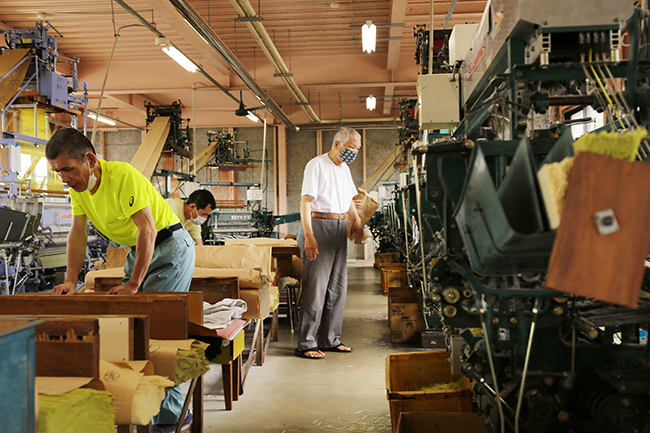 ポリプロピレン製のゴザを織機で生産しています。材料を織機に乗せることからミシンをかけて折りたたむまで様々な工程があります。